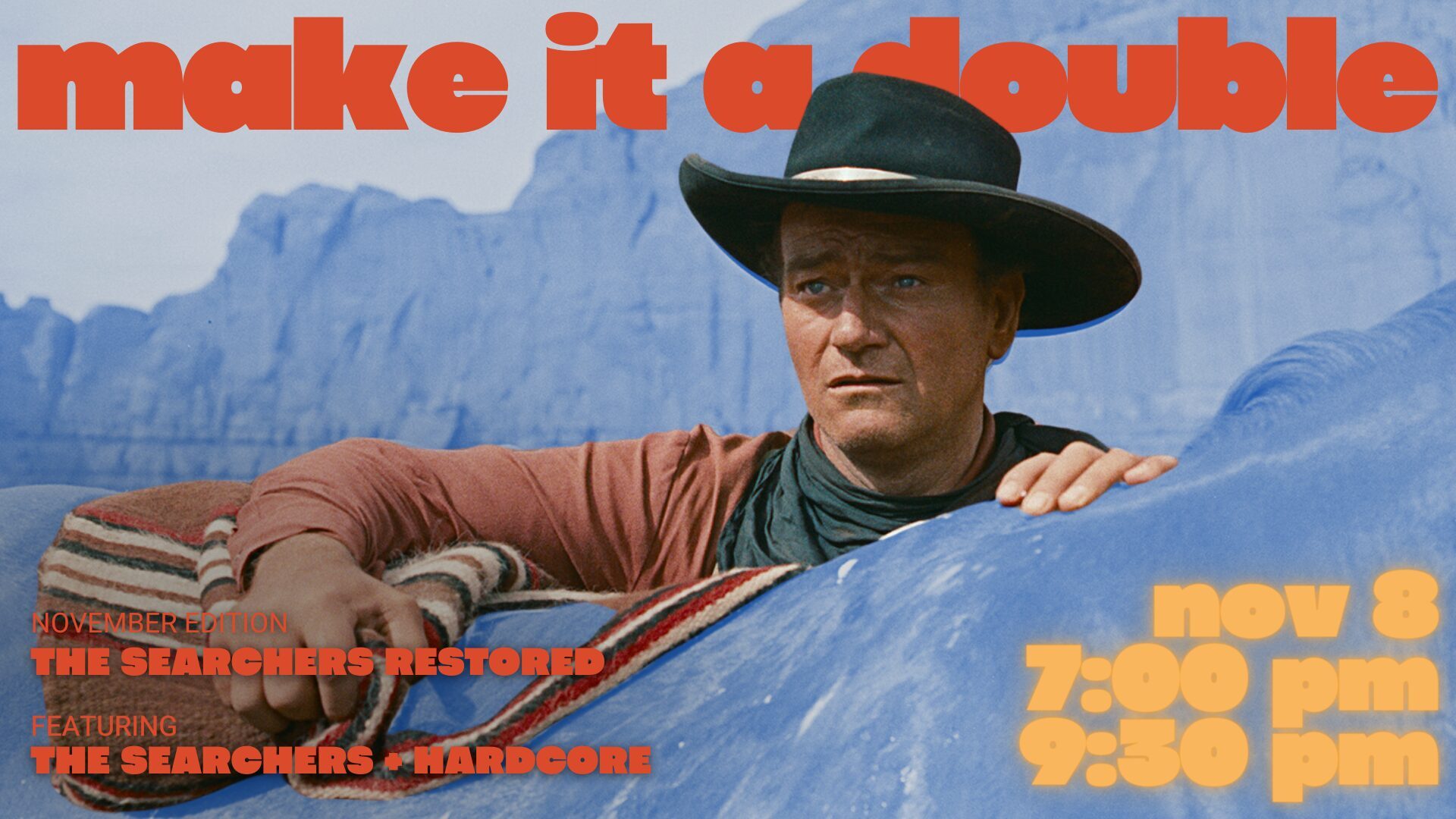 On Friday, November 8, our Make it a Double series returns with a 4K restoration of John Ford’s western masterpiece The Searchers (1956) at 7pm paired with its most direct remake, Paul Schrader’s Hardcore (1979) at 9:30pm.