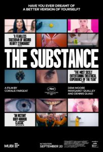 Demi Moore gives a career-best performance as Elisabeth Sparkle, a former A-lister past her prime and suddenly fired from her fitness TV show by repellent studio head Harvey (Dennis Quaid). She is then drawn to the opportunity presented by a mysterious new drug: THE SUBSTANCE. All it takes is one injection and she is reborn – temporarily – as the gorgeous, twentysomething Sue (Margaret Qualley). The only rule? Time needs to be split, exactly one week in one body, then one week in the other, without any exceptions. A perfect balance. What could go wrong? When Elisabeth’s ambitious younger self refuses to surrender her newfound fame, the elder begins paying the price, with a gruesome physical disintegration, among other consequences.