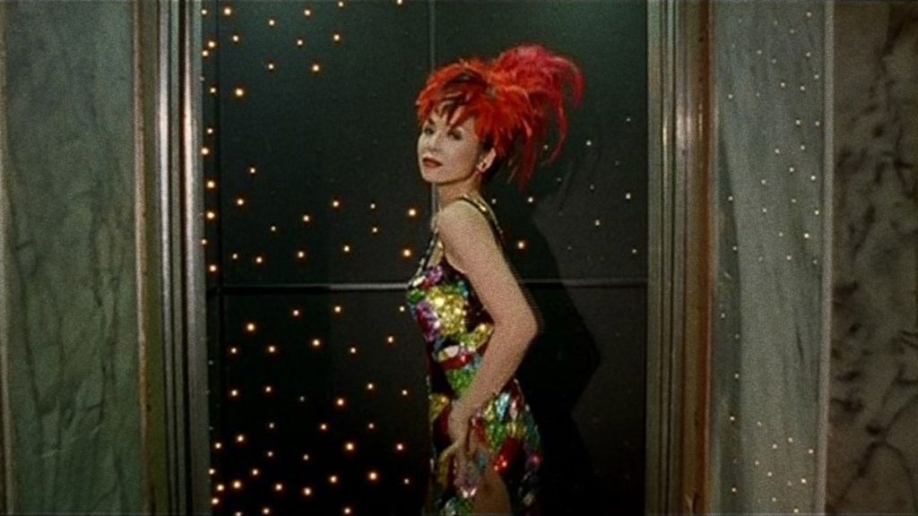 The first musical interlude come quite early on in the film. The camera slowly pushes forward as The Woman Downstairs dances and lip syncs to “Calypso” by 50’s pop icon Grace Chang, taking over the frame inch by inch in the brightly lit elevator and red showgirl outfit reminiscent of an entirely different era.